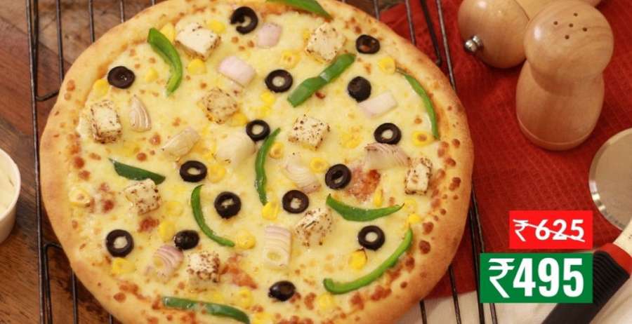 A La Pinoz special. Onion, Capsicum, Paneer, Sweet Corn & Olives With Cheese Dip