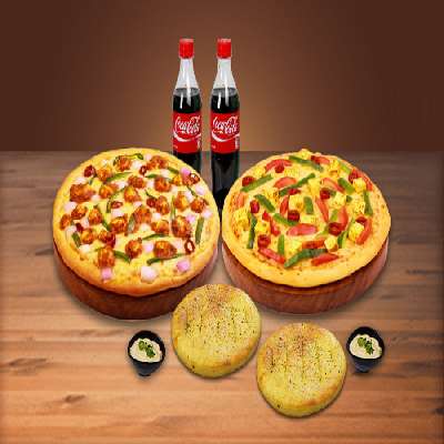 Exotic Tikka Pizza (Reg) + Keema and onion pizza(Reg) +Cheesy garlic bread +Coke
